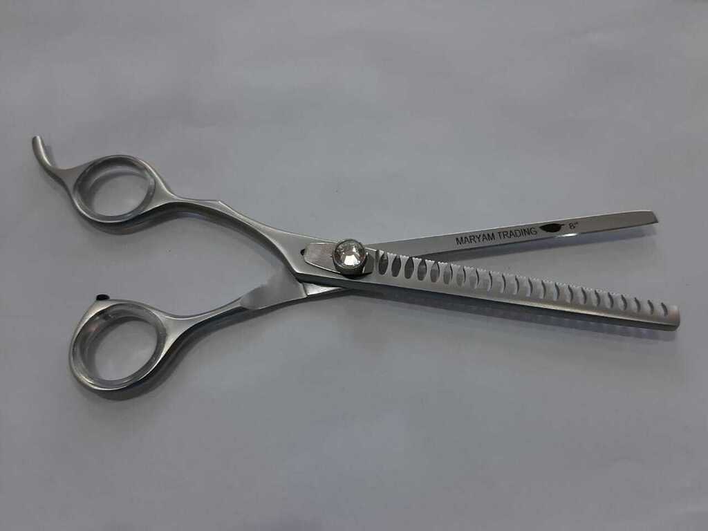 Tesoura Dente de Tubarão Maryam Trading 8" Canhoto. Liga metálica japonesa - aço 420. Cores variadas. foto ilustrativa.